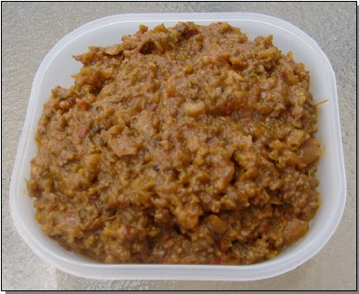 To the onions add 1kg mince, 1.25 litre juice, 3 tbl relish, 1 tbl mixed herbs, 2 tsp salt, pepper. Simmer until the meat is cooked. Then add the veggies. When the veggies are cooked mix 1-2 tbl of cornstarch into the remaining juice and add to sauce to thicken.