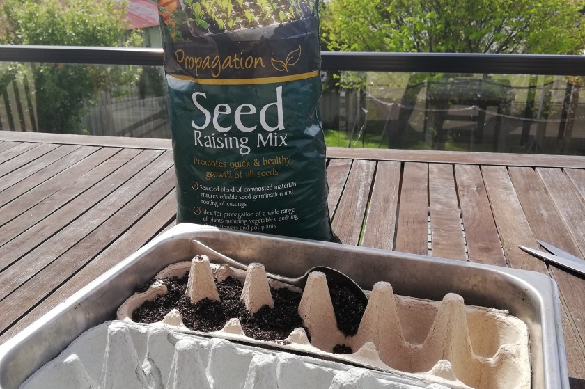 When the seedling grow bigger my plan is to cut each individual cup from the egg carton and plant it straight into the ground – thinking that the egg carton will breakdown.
