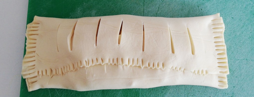 Fold over the top and bottom and crimp the edges with a fork. Spray a biscuit tray with oil, place on tray, and then spray oil over the top. Pop into a 200C oven for 20 minutes or until brown.