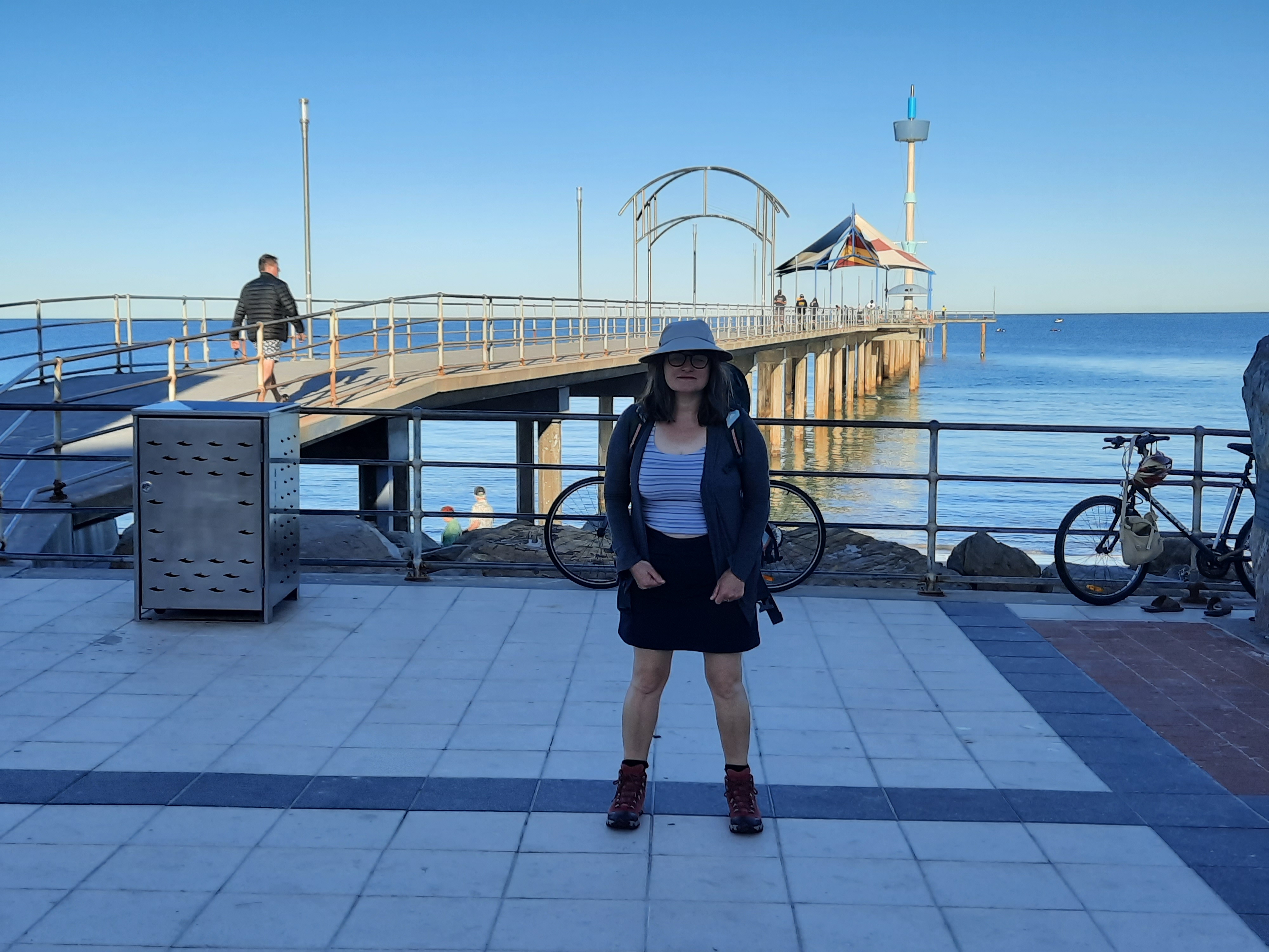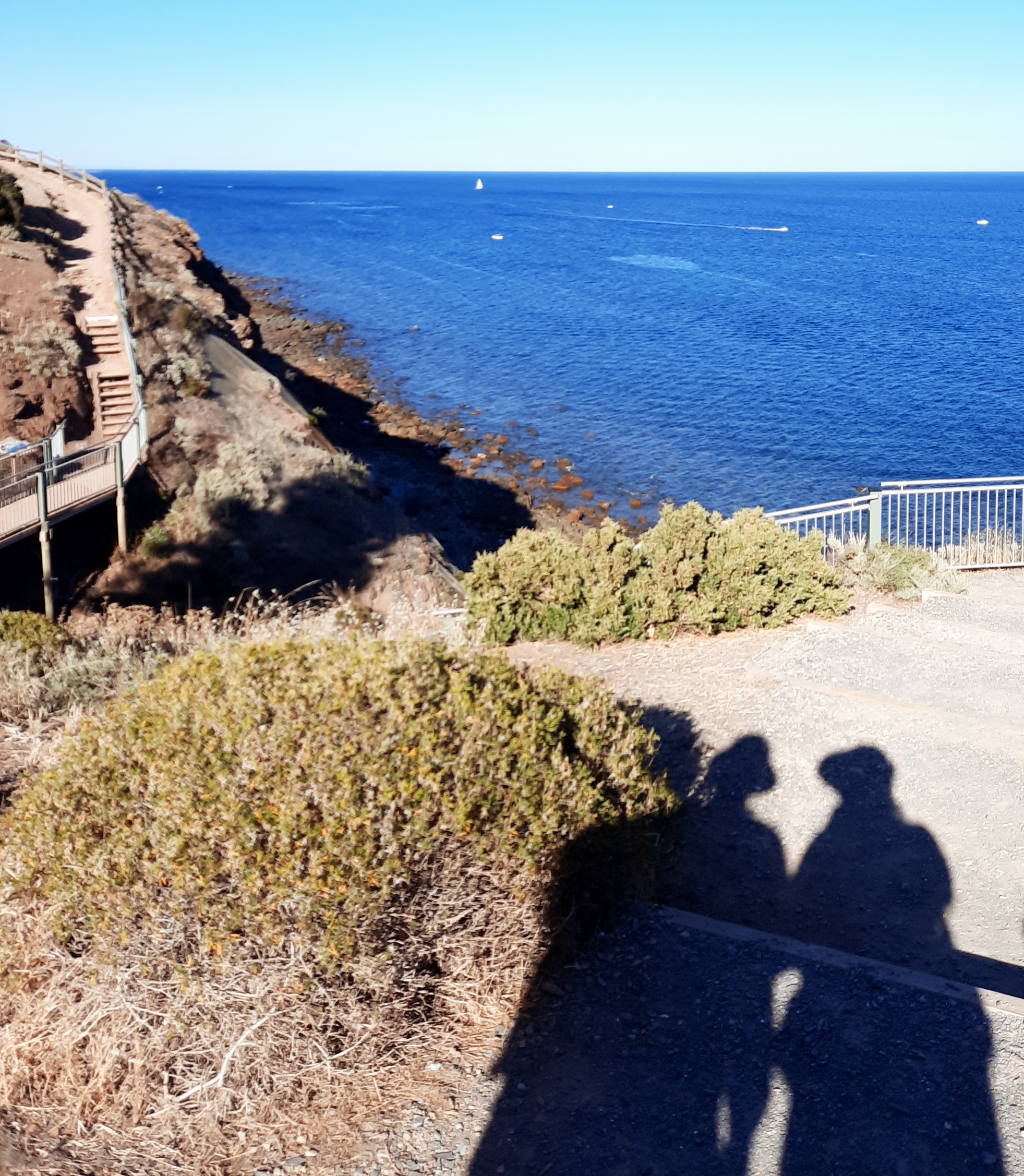We had hoped for a more comfortable day but the mercury went up to 34C and our course took us inland. We needed supplies and google spotted a shopping centre at Hallett Cove that didn’t look too far away. That added 30 minutes in the wrong direction, but the cool interior, clean bathrooms and sushi bar seemed like a fair exchange.