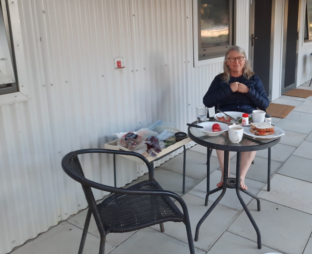 And so, at last, our day on the road comes to a close. A bottle of wine, exotic nibbles (prosciutto and melon) and the wonderful freedom of being the only people in the bushland area. We each had a single cabin, but of the four only ours were occupied. After 25km walking we were tired and in need of sleep. Just us, and the screechy things in the night.