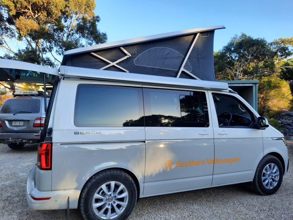 The company wonderful, the wine lovely. Not only did we enjoy a glass in situ, but also a bottle to take with us to Myponga, which raises the question of how to get there. It was now 5pm and we needed to get moving. True to her word Erin had arranged for one of her friends to drop us at Heysen’s Rest, but imagine our delight at being transported in Volkswagen’s latest kitted and fitted van. Pop up roof, fridge, seat-fold bed, and still a five-seater. Wonderful! Dane gave us a quick show and tell before heading back. It makes my recent improvements to the Delica look a bit sad.