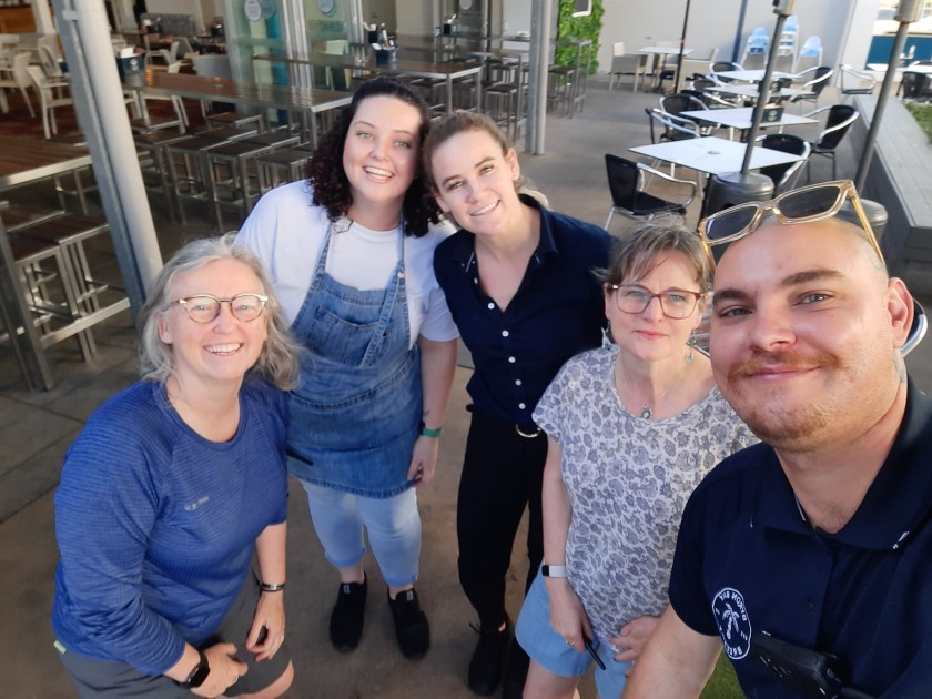 We reached our goal of getting to Kingscliff Beach to stop for lunch. Just that it was now 2pm and we had already eaten many of our lunch snacks. Oh well. Debbie was after a coffee so we decided upon the Kingscliff Beach Hotel which had a welcoming outdoor lunch garden. While testing out their very tasty Duck Spring Rolls we got talking to the friendly waitress, Kohbe. When she discovered that we on a walking holiday and our destination that night was Pottsville, she posed a valid question. “Why? You do know we have cars here don’t you?”