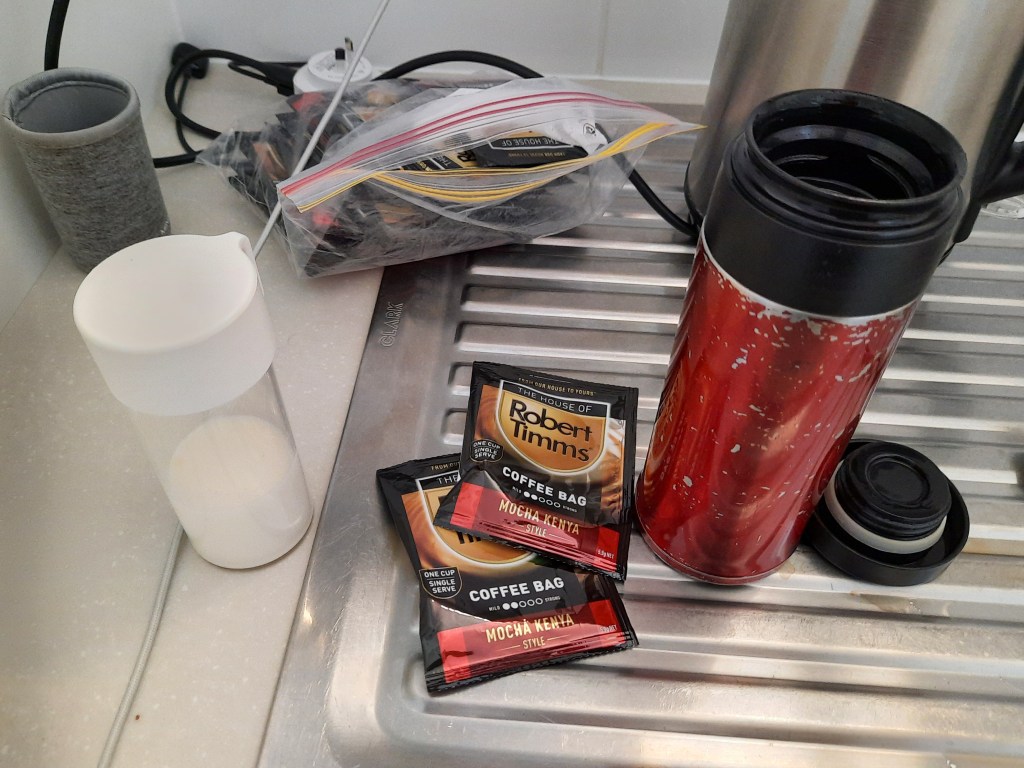 I rely on Robert Timms Mocha Kenya coffee bags, but they aren’t always available in the local IGA so we brought enough to survive, two bags per day. And I always leave with the flask full for sipping along the road.