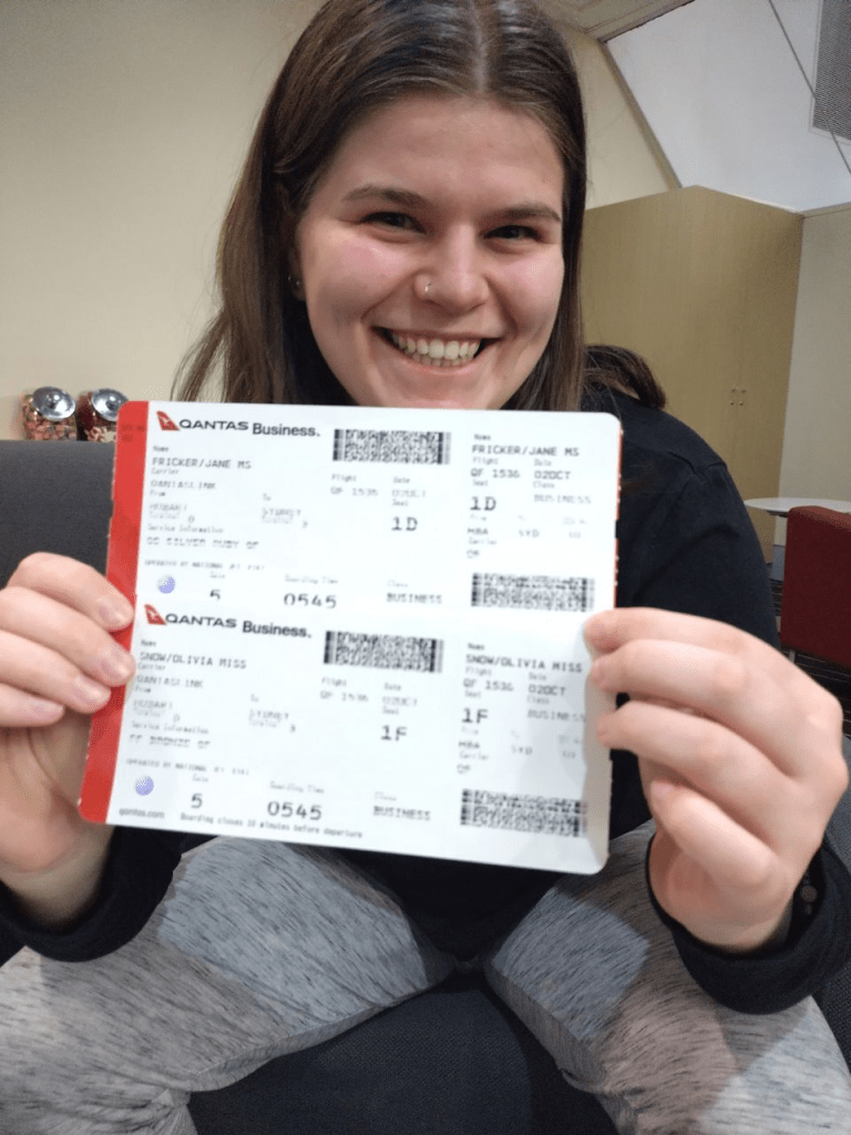 We have arrived at Hobart airport and just found out we have been upgraded to business class to Sydney. I also think Olivia set a new world record for checked luggage. My pack weighed a hefty 6.8kg while hers topped the scales at 3.4kgs!