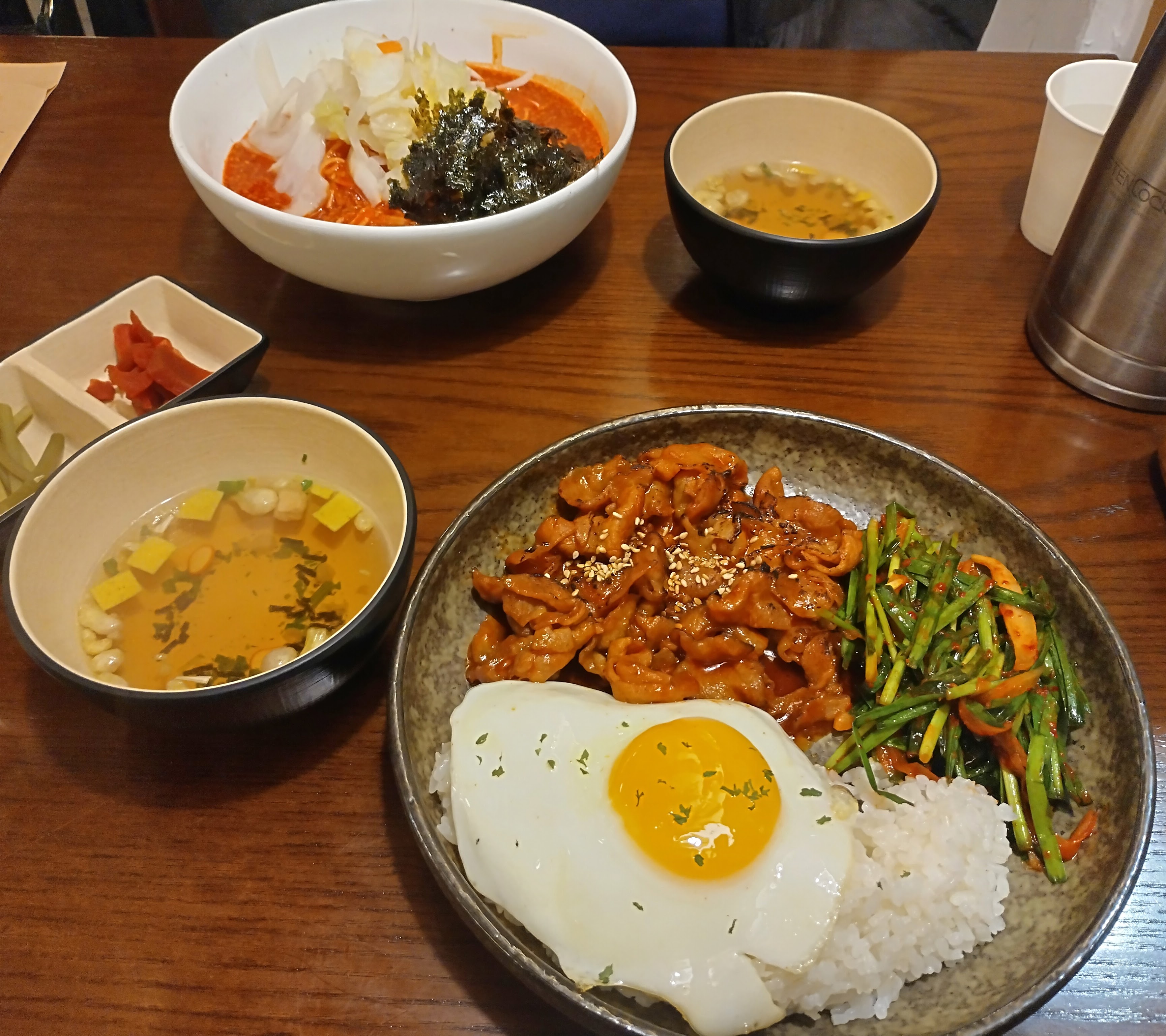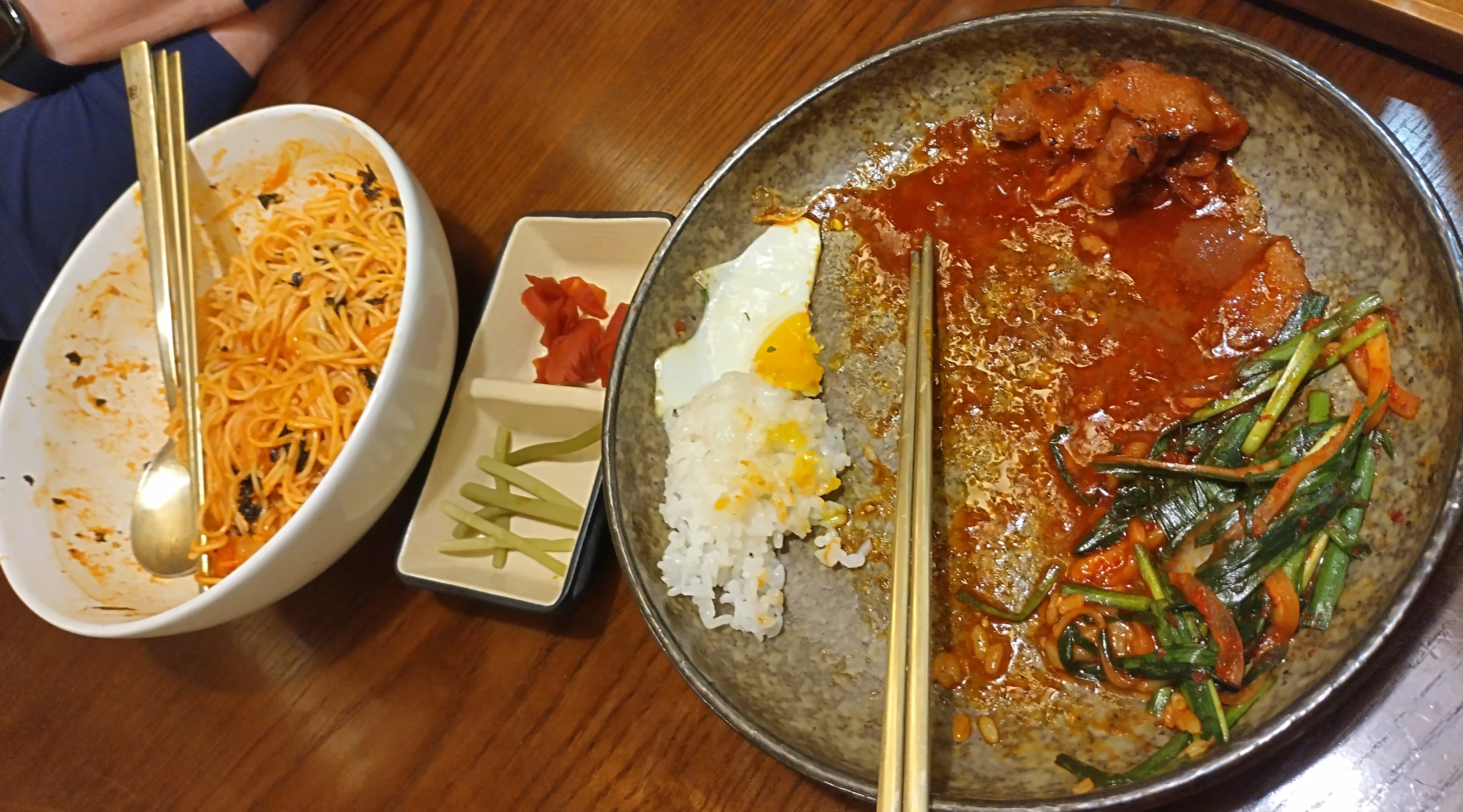 Our culinary exploration was rounded off with dinner at the home of “authentic Korean food”. The before and after photos showed how far we got. Debbie’s sweet and tangy cold noodles were filling and bland. We explored, but failed to resolve, what combination of deprivation and desperation would make this a national dish. My BBQ pork and rice was tasty, but so ridiculously spicy that even a litre of water and half a bottle of soju couldn’t clear a path for all of it.