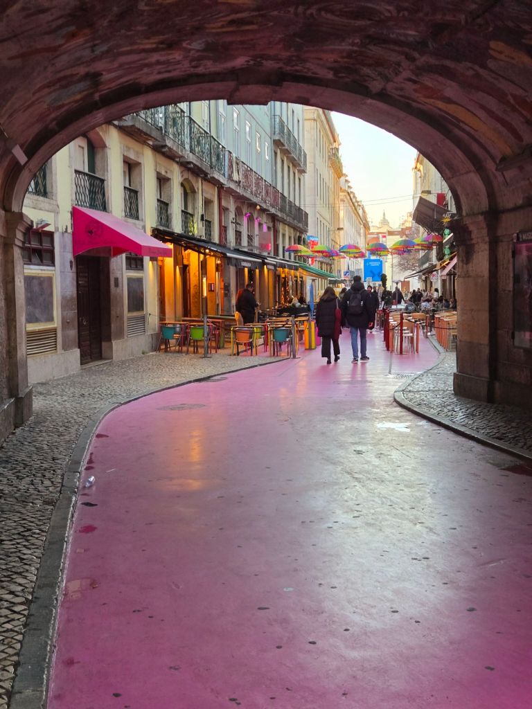 Pink Street is a very short cafe, nightclub, bar and strip joint section of Lisbon. It was fairly quiet while we were there but apparently livens up as darkness falls.