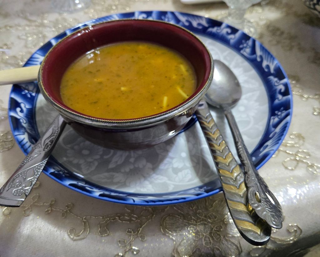 I didn’t take many photos (well one exactly) but the meal consisted of dates, soup, couscous, vegetables, chicken, cake and fruit.