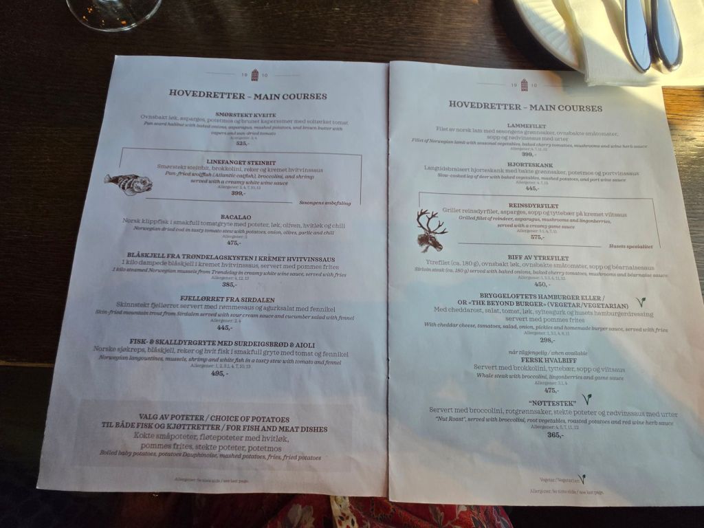 We decided to live it up a bit in Bergen (after eating home made meals on the cruise) by having a nosh up dinner at the famous Brygelofter restaurant. Family owned for generations.