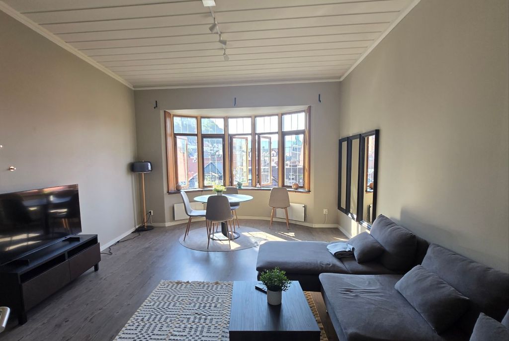 Accommodation in Bergan is expensive, so we selected a room in an apartment with shared facilities. Expecting some doss-house, we were very surprised to find a modern apartment, with four locked private rooms and shared kitchen, lounge, toilet room, laundry room with shower, and shower room with toilet. The perfect combination to keep all residents clean.